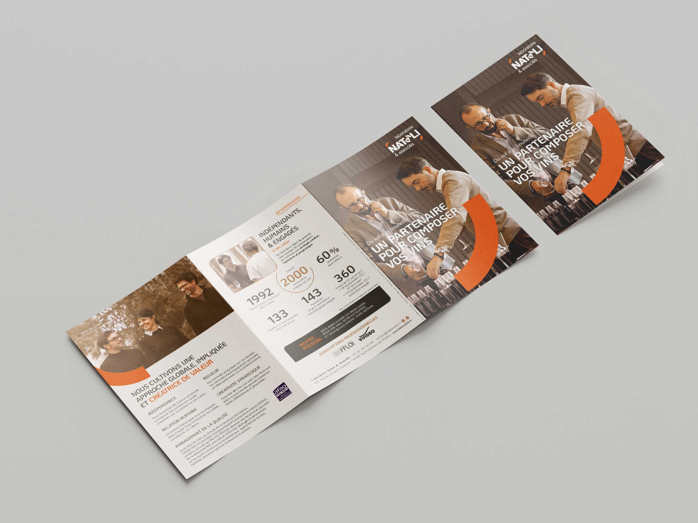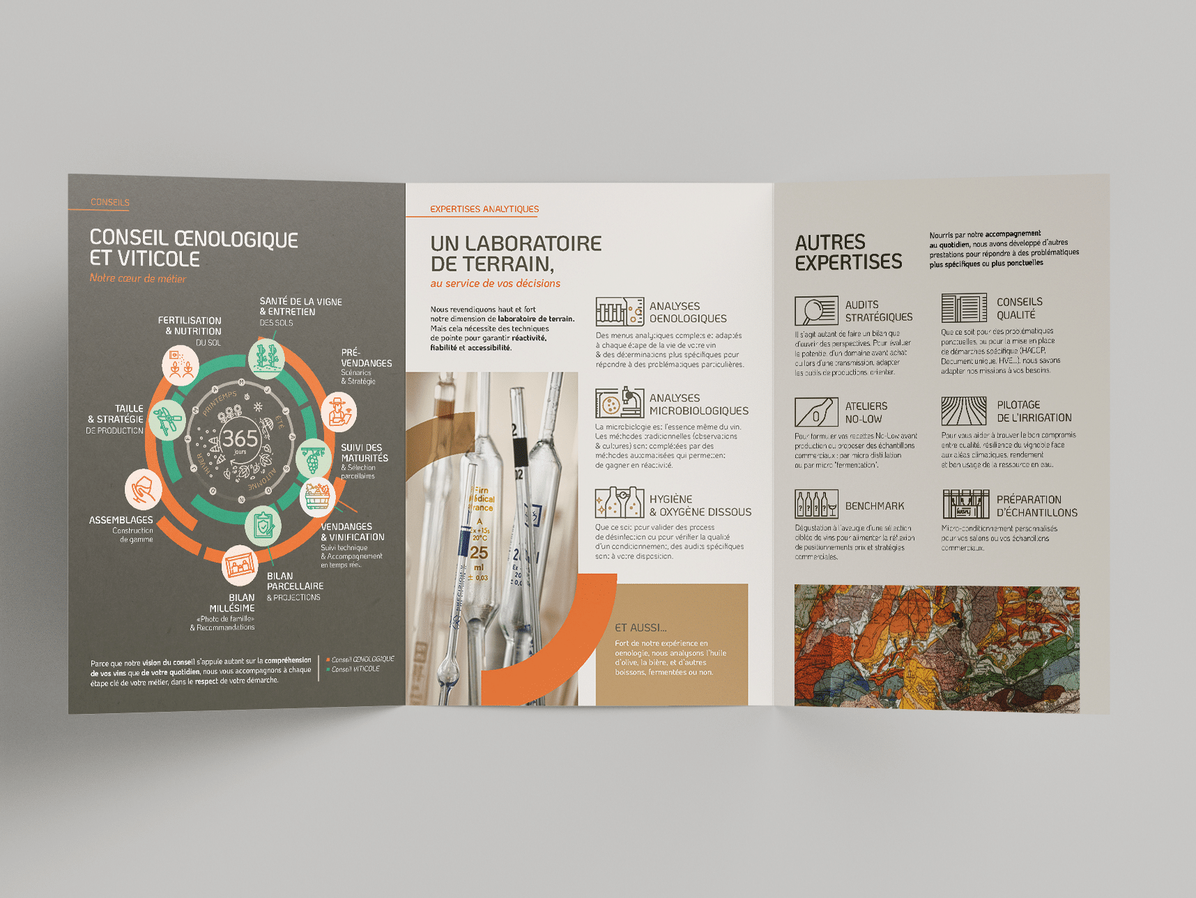 Une fois l’identité stabilisée, nous avons repris le dépliant. Travail du chemin de fer pour structurer le discours : recto dédié aux services – verso centré sur les valeurs et chiffres clés. Nous avons conçu le schéma des 365 jours d’accompagnement des vignerons (un accompagnement rythmé par les saisons), puis dessiné l’ensemble des pictogrammes métiers sur mesure, en cohérence avec le moodboard validé. Les chiffres clés et partenaires ont été valorisés en quatrième de couverture pour renforcer la dimension rassurante et commerciale.